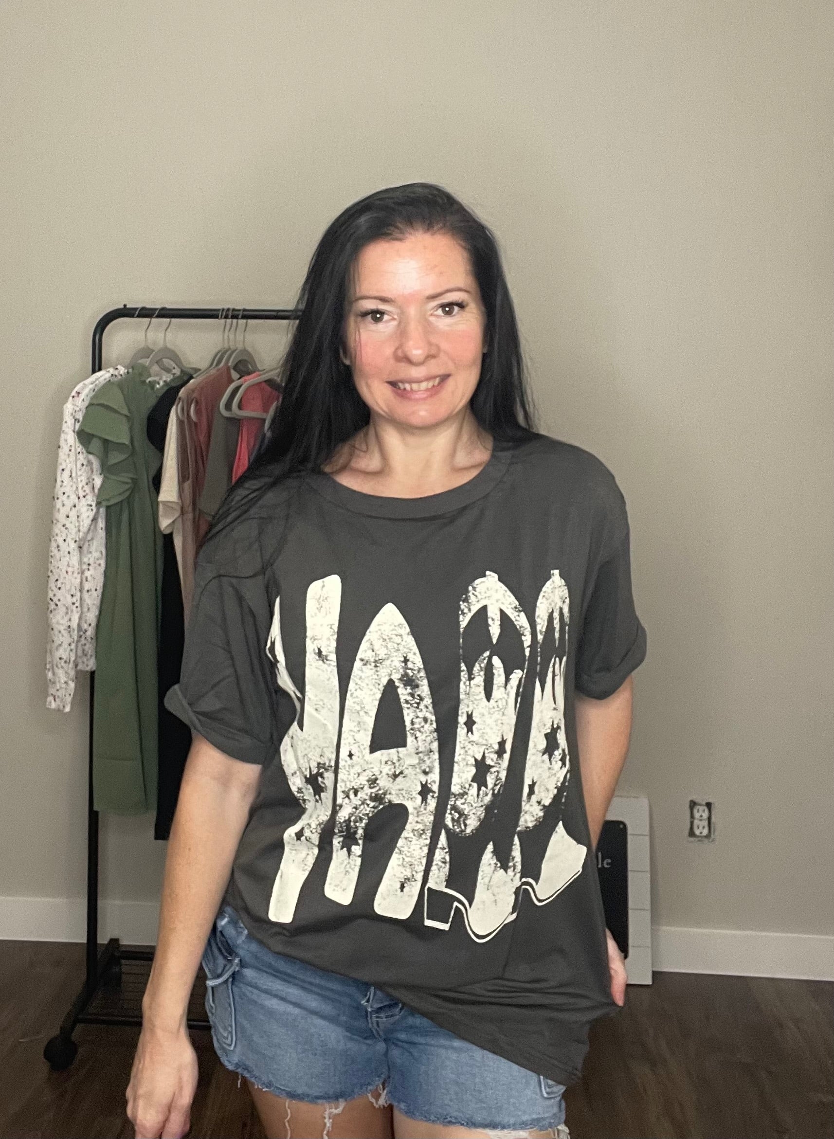 Oversized vintage-inspired YALL cowboy boots graphic tee.