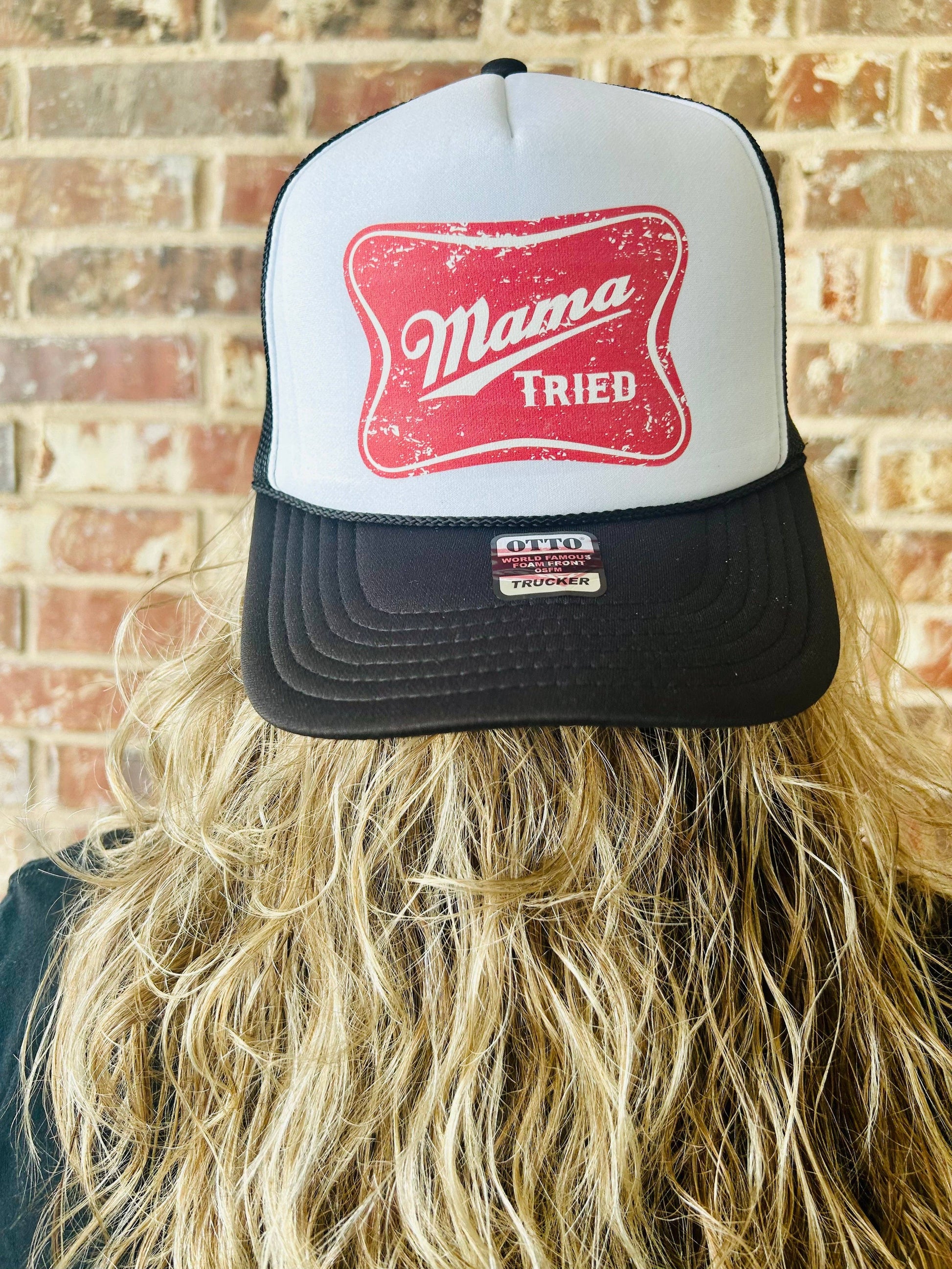 "Mama Tried" design direct-to-film printed on a Black & White foam trucker hat. The perfect accessory to make a bold statement!