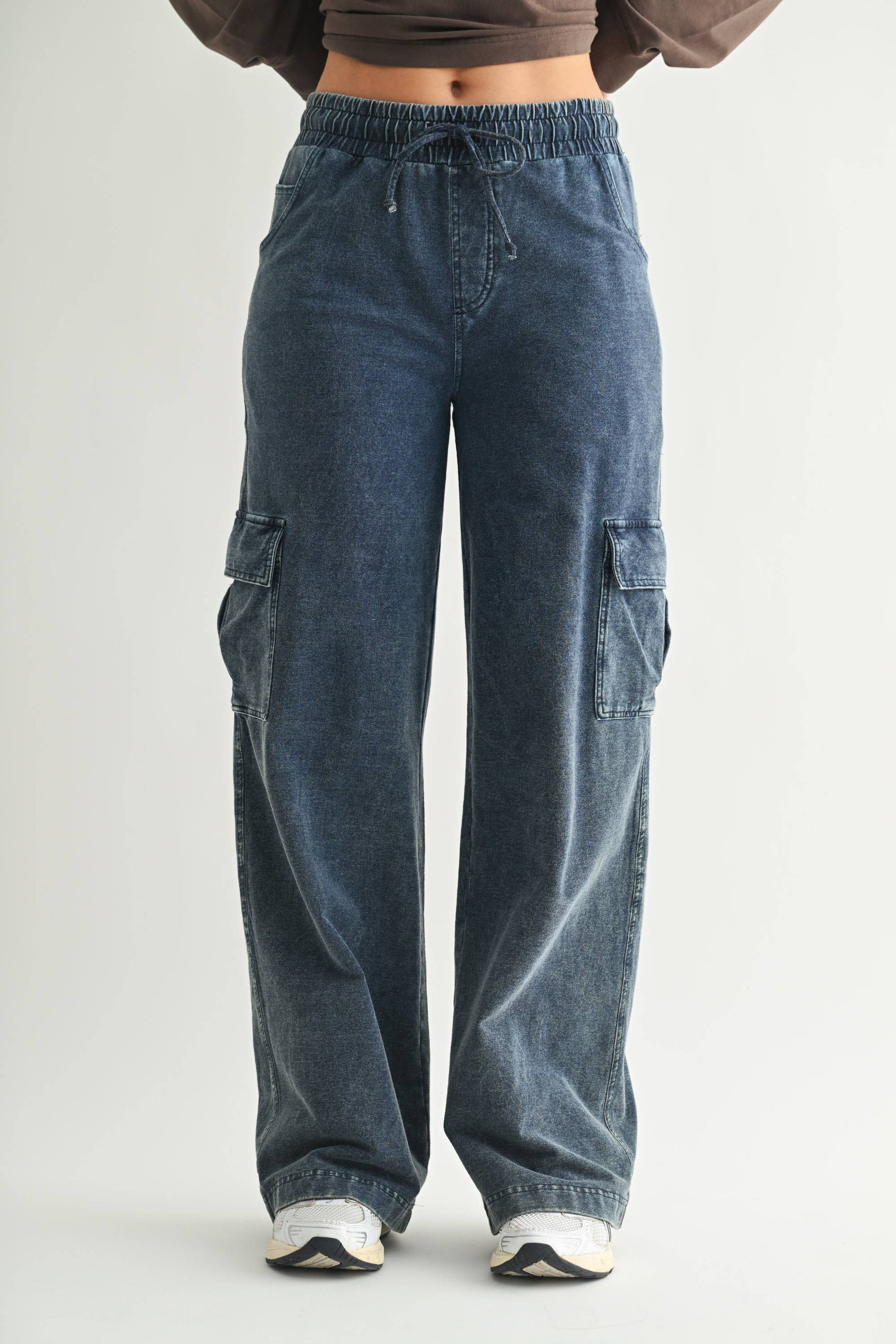 Love the look of denim, but hate feeling uncomfortable? These wide leg cargo pants are the answer! Made with a soft and stretchy mineral wash Terry fabric that gives the look of denim, they feature 4-way stretch and an elastic drawcord waist.